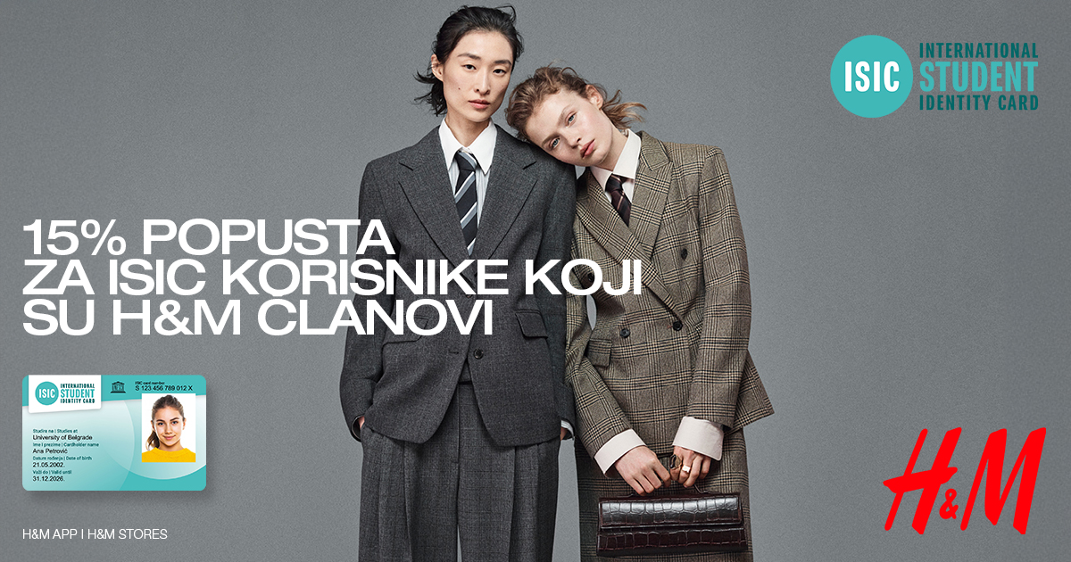 🔔 Korisnici ISIC kartice koji su i H&M članovi, ostvaruju 15% popusta u H&M aplikaciji, kao i u H&M radnjama širom Srbije.